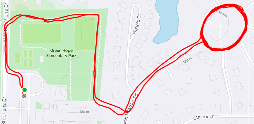 3) Mosey back along Birch Meadow to the Greenway. Squats x10 On My Down (OMD)