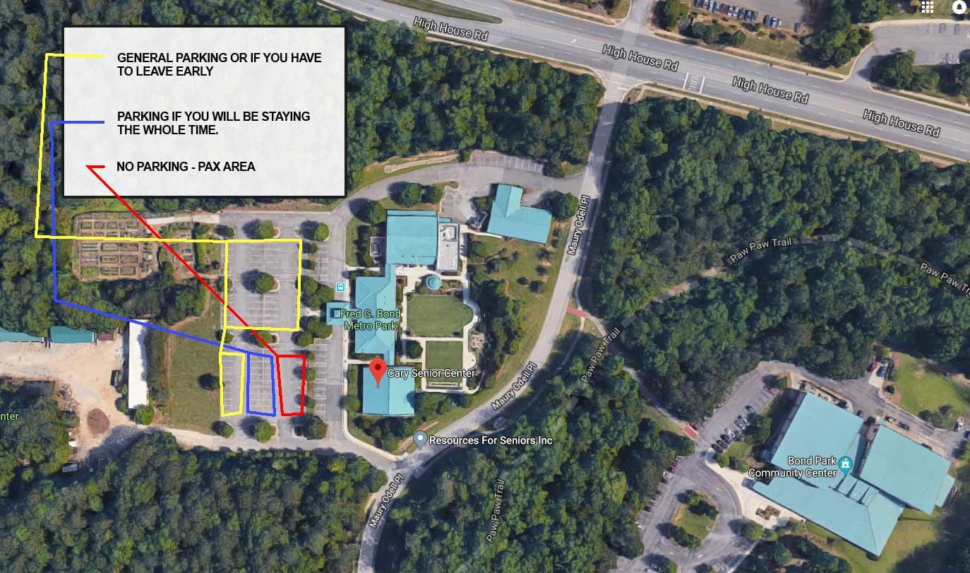 - If you know you need to leave before 0700 try and park on the backside of the parking lot (yellow).