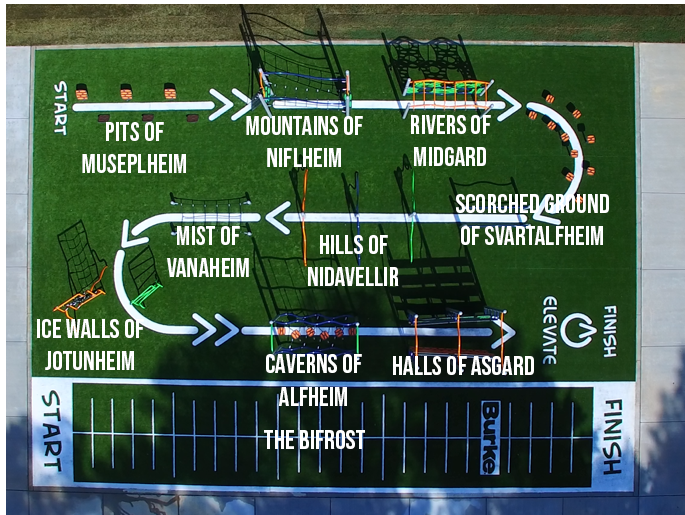 The Asgardian Warrior Training Grounds consisted taking the BIFROST (25 yard sprint and a 25 yard agility cone work) then traveling across the NINE REALMS testing one’s strength and character. See map below: