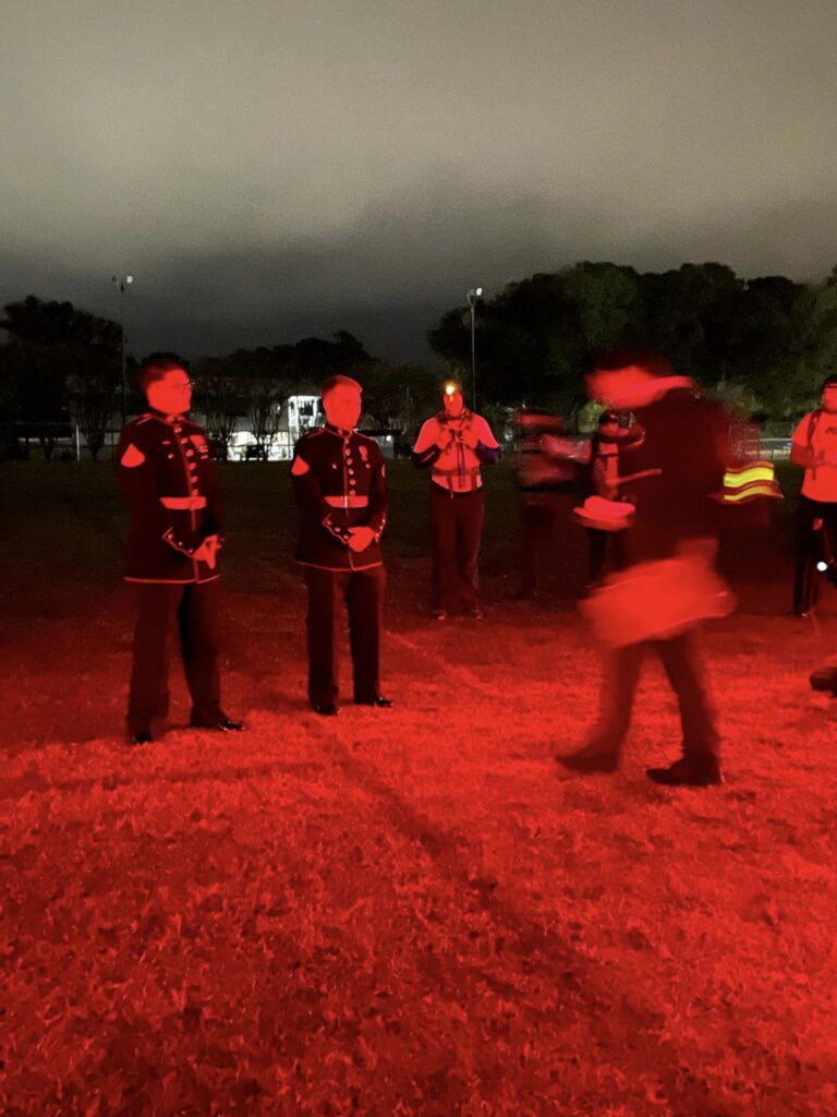 Next, we practiced getting into formation and moving safely with our platoon before picking up our sandbags and getting back into formation for our first inter-platoon competition, a ruck overhead hold. Red platoon had two members go over 5:30 on their hold for the competition win. Our platoon leader was able to assign each of the three class weights to a platoon; the three class weights were a nautical chain, a battleship cut out of a piece of metal, and a wheel contraption. Our team ended up with the chain, which was certainly the easiest to transport. We were given a few minutes to replenish water, reorganize/repack our ruck, and have a bite to eat. We also had a couple of visitors. Apparently, a group of 3 marines had left the Marine Ball and saw a bunch of red lights out in the middle of the field and thought, “why are all those cars out there doing donuts?” so, they pulled in to check it out only to encounter us. They spoke with the Cadre and the Cadre gave them a few minutes to speak to us about who they were and what they were doing; this was really cool.