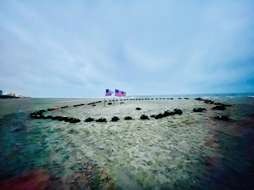 We were able to leave our logs and sandbags behind as we were told we’d be heading out on a 3 mile ruck down the beach and we needed to be completely silent. As we headed out, there was definitely a sense of relief and “relaxation” being able to move without any coupons. The good thing about starting this movement is that I was able to warm up quicker; however, we were still rucking in the soft sand, on the beach, in the wind and rain so, there was only so much warming up you could do. I found myself using a tactic Bono had mentioned earlier of just counting my steps so, I just kept counting up to 100 until we finally made it to the end of the ruck. It started to get brighter and brighter so I knew the sun was coming up. I had done some research ahead of time and knew that the sunrise in Carolina Beach was at 6:41AM, so I knew we had to be close to done. We planted our flags and circled up around them as a class for our next activity, a Hero WOD.