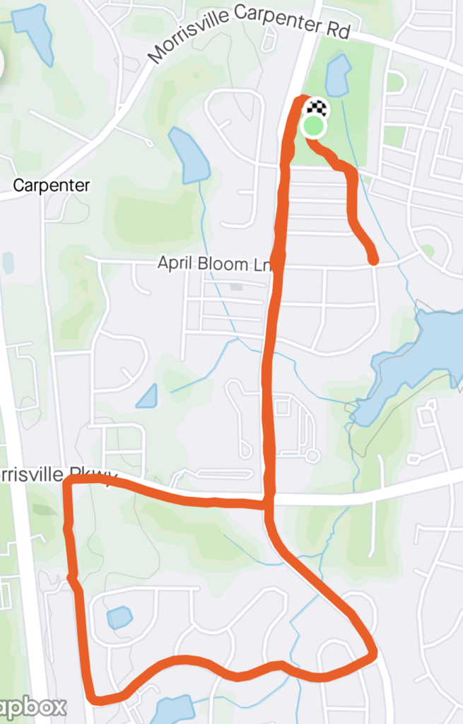 Explained the Strava art route – straight down Louis Stephens, take a right through Heritage Pines, back up Carpenter Upchurch Rd, right on Morrisville Pkwy, and back up to Carpenter Park. Given the 3+ mi route I offered a down & back option to ensure we were back in time for Part II. Some confused faces but off we went.