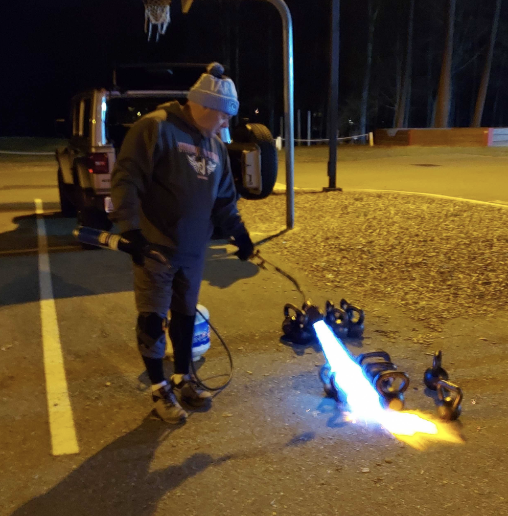 OK, so I had a pretty rigorous Kettlebell workout planned but I was concerned we would have a limited turn out due to the cold weather and I was also concerned that I planned on having a 25lb chunk of iron, that just spent the night outside in the freezing cold, in everyone’s hands for 40 minutes. So I did what any of us would do - I brought a flame thrower to the party to warm the bells up!